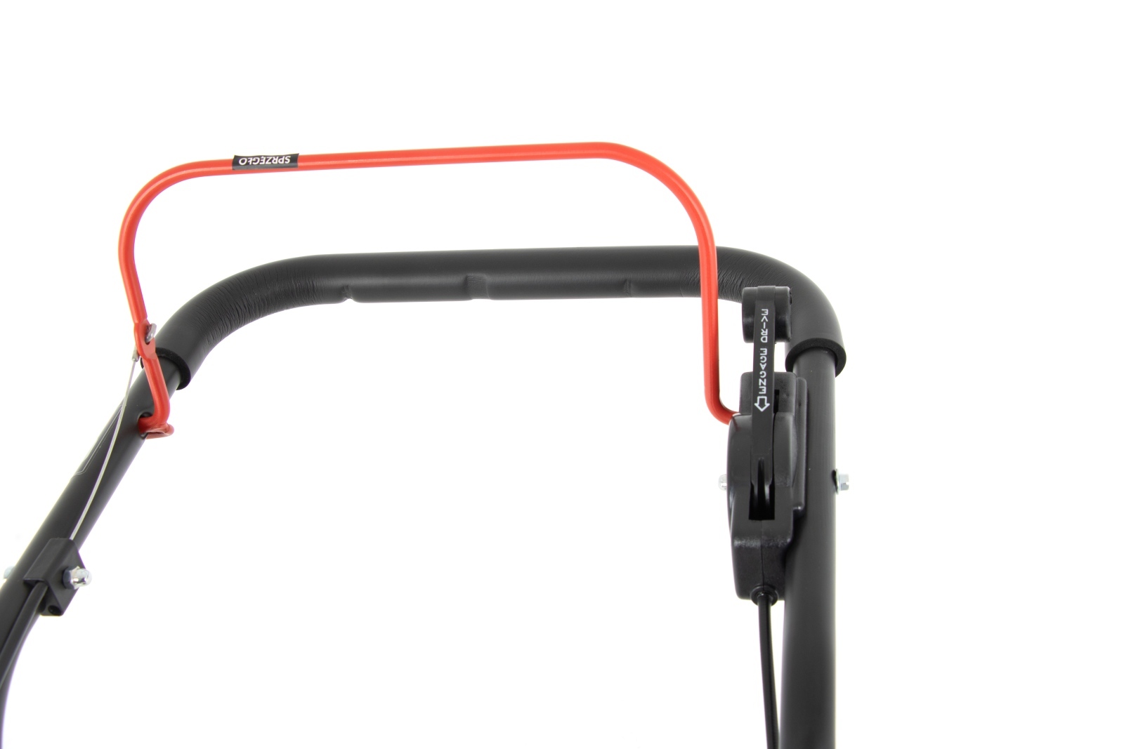 Kosiarka wyposażona jest w sprzęgło, które uniemożliwia uruchamianie elementu tnącego podczas odpalania, co zapewnia bezpieczną pracę nawet przy rozruchu silnika. Dodatkowo, wyłącznik bezpieczeństwa chroni użytkownika przed niepożądanymi wypadkami, zapewniając bezpieczne użytkowanie maszyny.