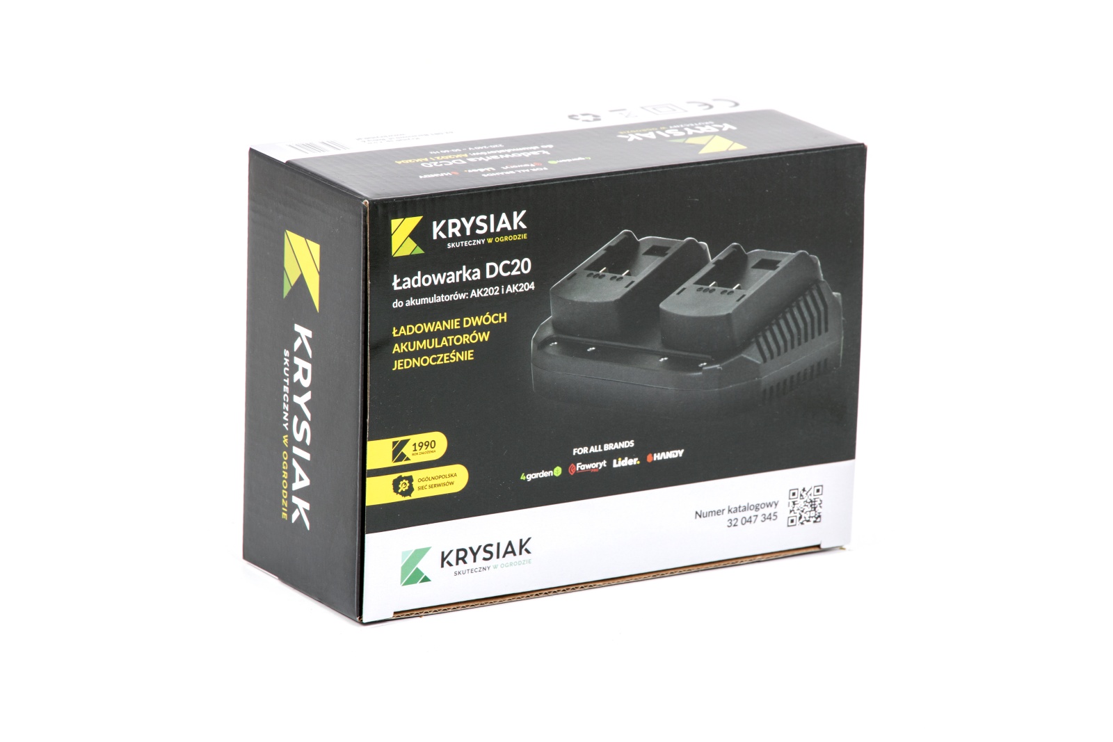 Podwójna ładowarka Krysiak DC20 do wydajnych akumulatorów litowo-jonowych pasujących do wszystkich urządzeń ogrodowych z rodziny 4garden, Faworyt Pro, Lider, Handy 20V i 2×20 V