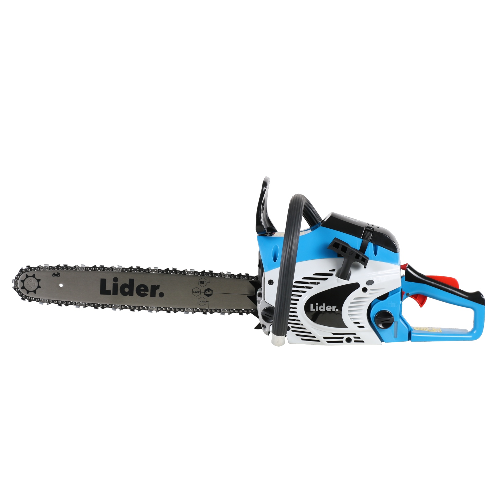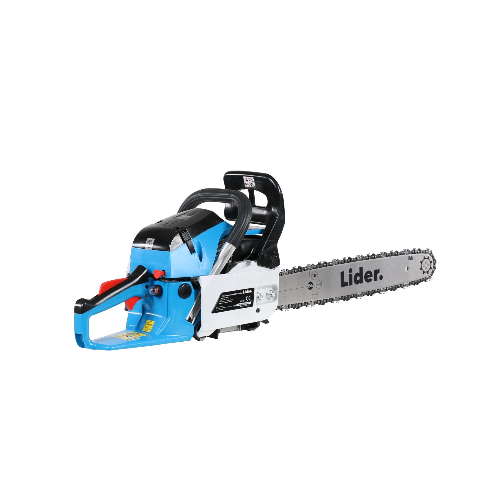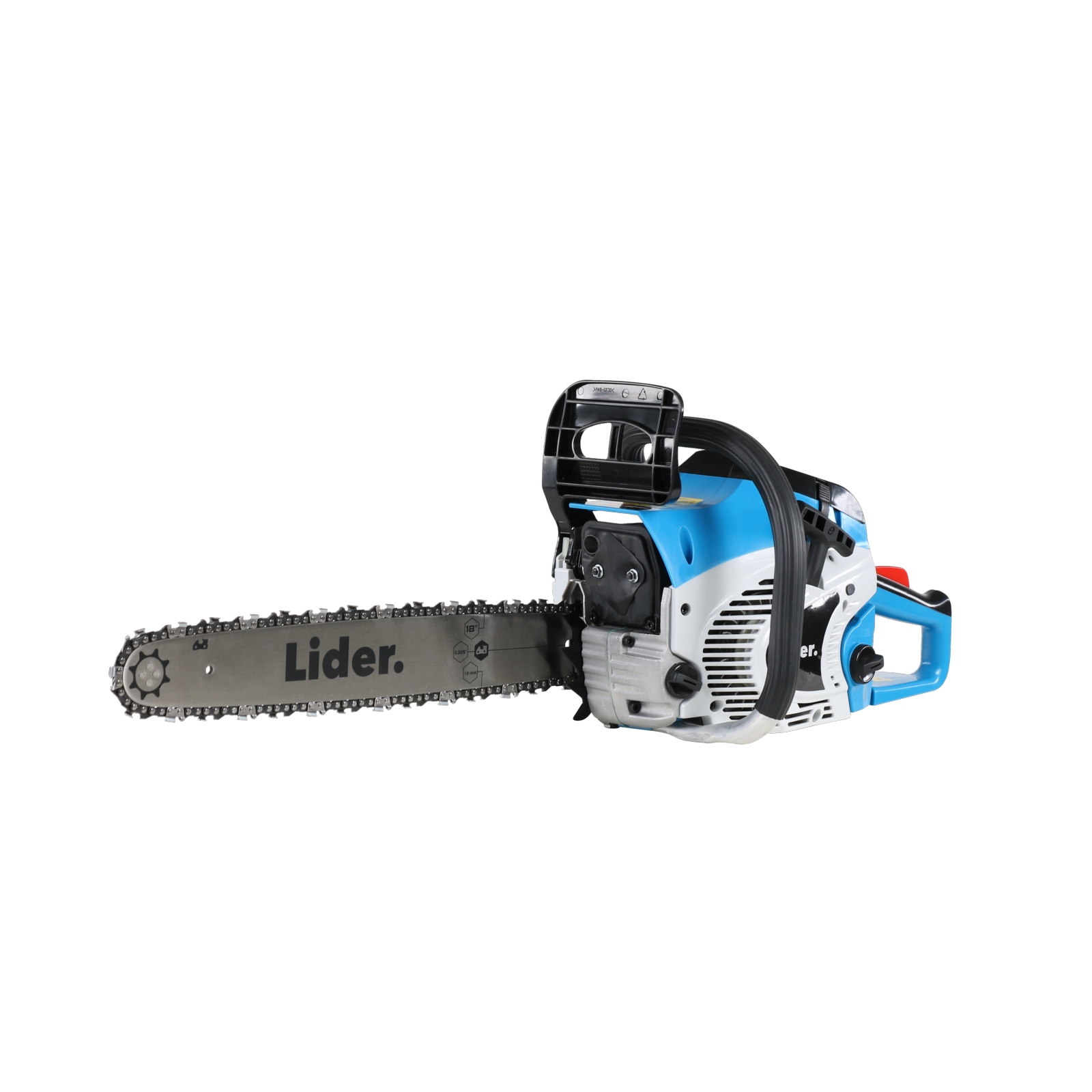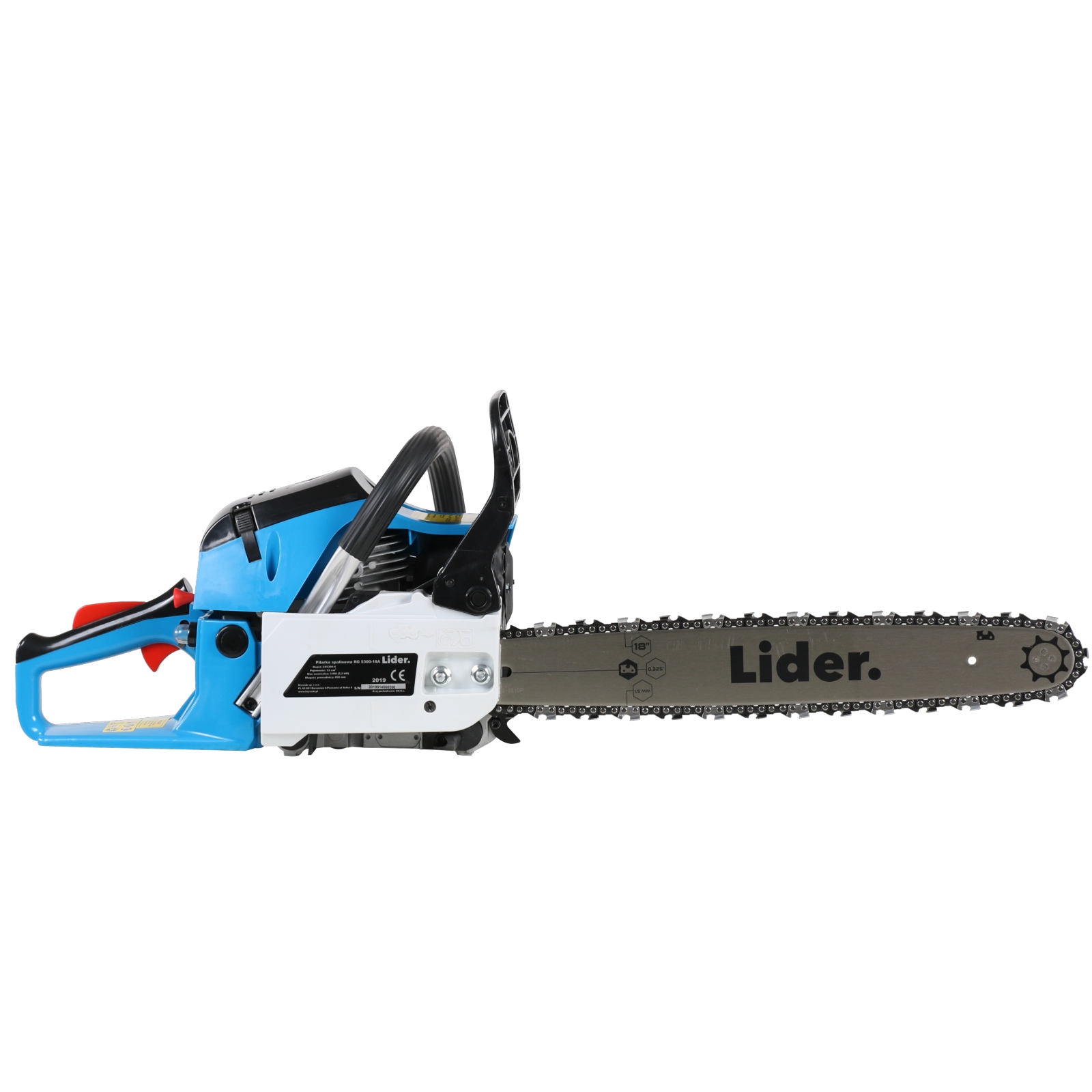 Pilarka spalinowa Lider RG 5318-A4 to wydajna, klasyczna pilarka farmerska. Opisywany model jest najnowszą wersją urządzenia marki Lider. Skuteczność pracy zapewnia 2-suwowy silnik spalinowy o pojemności 53 cm3 i mocy 2,7 KM, a także prowadnica o długości 45 cm. Producent skupił się na tym, aby połączyć skuteczność pracy z jej wygodą. W rezultacie użytkownik otrzymuje urządzenie z doskonale sprawdzającym się w praktyce systemem antywibracyjnym, wskaźnikiem zbiornika paliwa oraz automatycznym smarowaniem łańcucha. Jako, że jest to sprzęt przeznaczony do obróbki drewna na domowe potrzeby, zadbano również o jego prezentację. Stąd też pilarka spalinowa Lider RG 5318-A4 dostępna jest w gustownie prezentującym się, niebieskim kolorze. Wypróbuj możliwości opisywanej pilarki do cięcia kłód, gałęzi, czy tarcicy w swoim prywatnym ogrodzie!